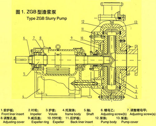 ZGB系列渣漿泵為雙泵殼結(jié)構(gòu),即泵體、泵蓋帶有可更換的耐磨金屬內(nèi)襯(包括葉輪、護套、護板等)。泵體、泵蓋根據(jù)工作壓力采用灰鑄鐵或墨鑄鐵鑄造。該系列泵均為垂直中開式,泵體有止口與托架用螺栓聯(lián)接。泵的吐出口方向可按45度間隔八個角度旋轉(zhuǎn)安裝。葉輪前后蓋板設(shè)有背葉片以減少泄漏及提高泵的使用壽命。該系列泵進口為水平方向,從傳動方向看泵為順時針方向旋轉(zhuǎn)。起動及使用時嚴禁電機反方向旋轉(zhuǎn),否則,將葉輪脫落造成事故。