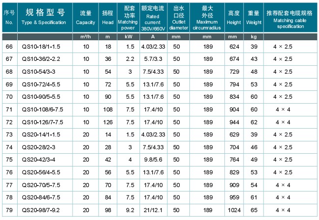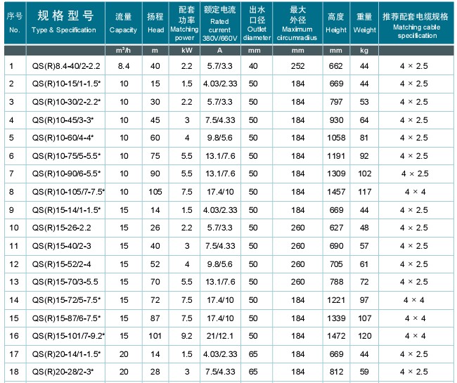 QS型水電泵廣泛用于農(nóng)田排灌、工業(yè)及民用建筑的供、排水系統(tǒng),噴泉工程,以及丘陵、山區(qū)的引水,低洼地區(qū)的排澇等。其特點(diǎn)是:電機(jī)、水泵組成一體,結(jié)構(gòu)簡單,且安裝拆卸方便,安裝占地面積少,使用維護(hù)簡單,運(yùn)轉(zhuǎn)安全可靠。目前,我公司可向用戶提供揚(yáng)程5-75米,流量15-250米3/小時,電機(jī)功率0.75-7.5kw等三十幾種型號的潛水電泵。