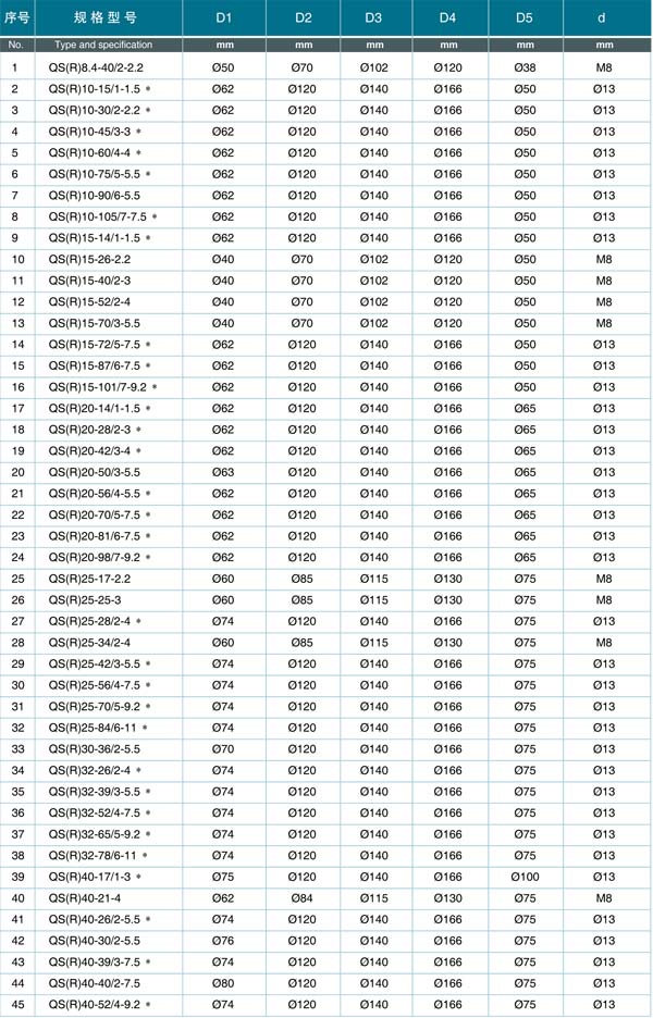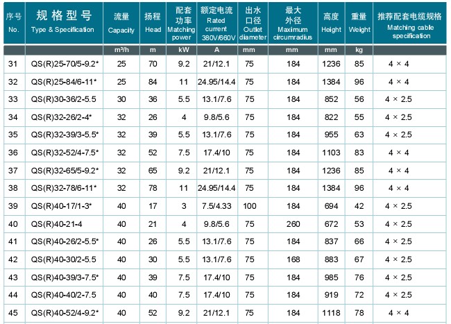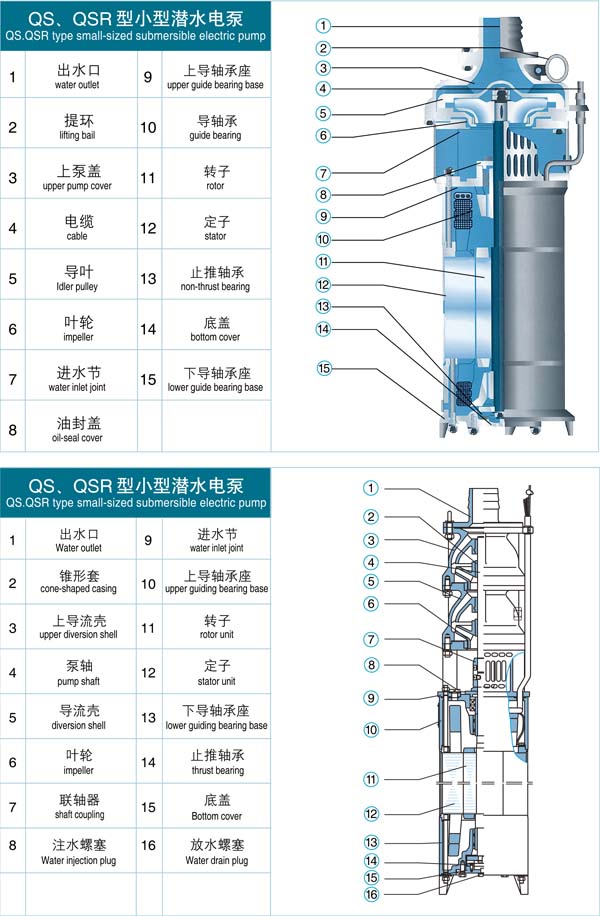 QS型潛水電泵、潛水電機(jī)兩大部分組成。電機(jī)內(nèi)腔采用充水式定子繞組采用聚乙烯絕緣尼龍?zhí)啄退姶啪€,保證電機(jī)在水介質(zhì)中正常工作,定轉(zhuǎn)子表面涂特殊的耐水涂料,轉(zhuǎn)子軸伸端有甩砂器,有效的阻止泥沙與水浸入電機(jī)腔內(nèi),軸承室填充耐水潤滑脂,并用骨架油封保護(hù),有效地防止液體進(jìn)入軸承室損壞軸承,電機(jī)腔內(nèi)充入清潔的水,起到電機(jī)冷卻作用。