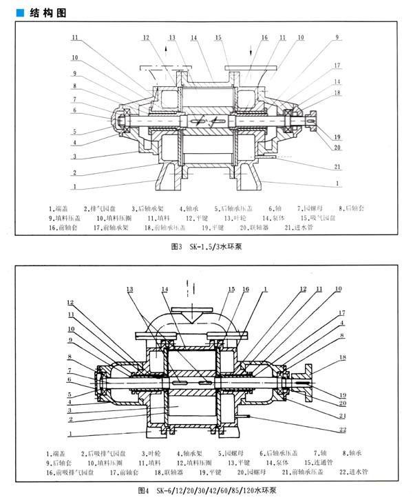 填料安裝在兩端蓋內(nèi),密封水經(jīng)由端蓋中的小孔進(jìn)入填料中,冷卻填料及加強(qiáng)密封效果。葉輪形成水環(huán)所需的補(bǔ)充水由供水管供給,供水管可與氣水分離器連在一起循環(huán)供水。
