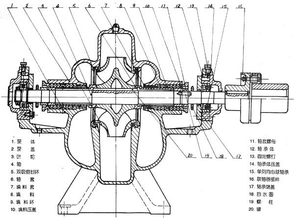 本系列泵的吸入口和吐出口均在水泵軸心線下方,呈水平方向,并與軸線垂直。泵殼中開(kāi),泵蓋用螺栓、定位銷固定在泵體上,無(wú)需拆卸管路及原動(dòng)機(jī)即可檢修。泵的主要零件有泵體、泵蓋、葉輪、軸、雙吸密封環(huán)、軸套和軸承等。