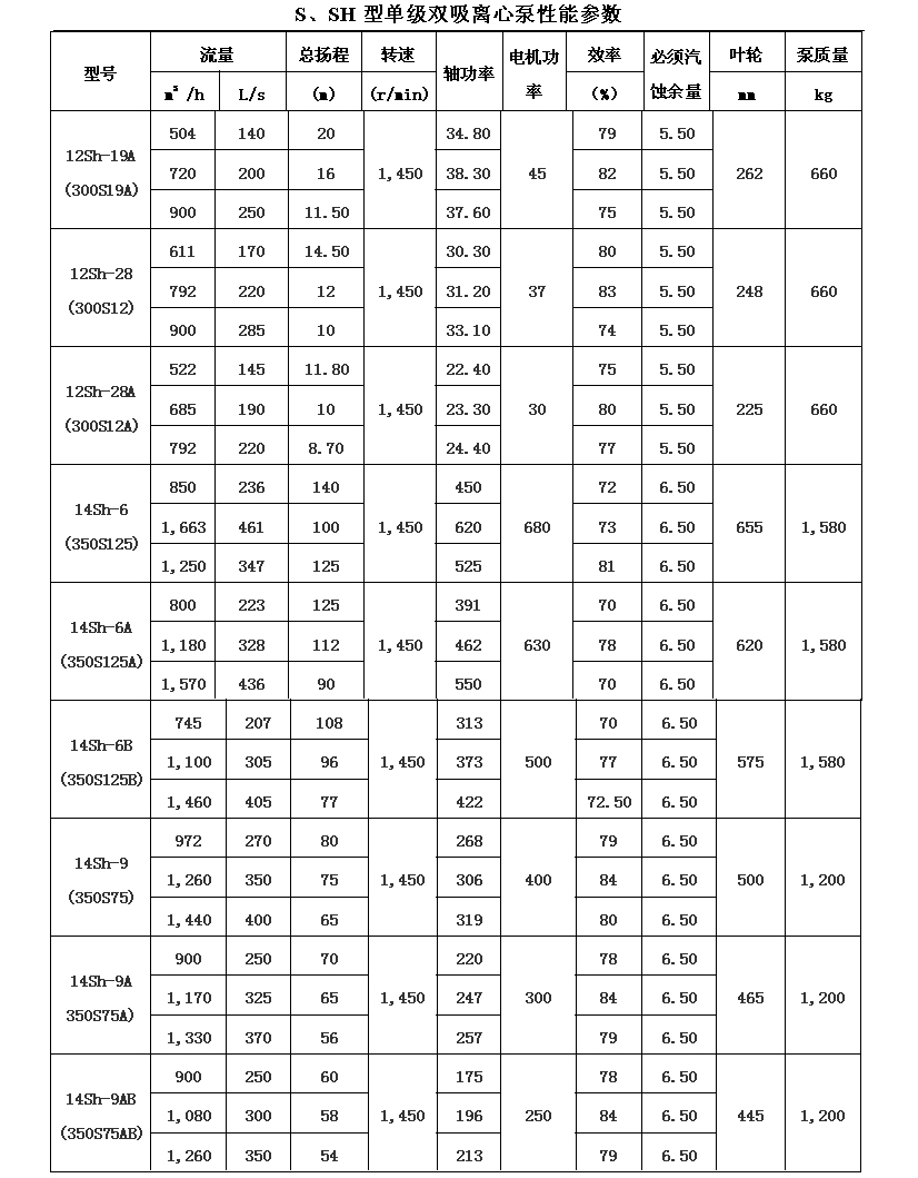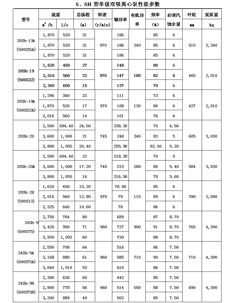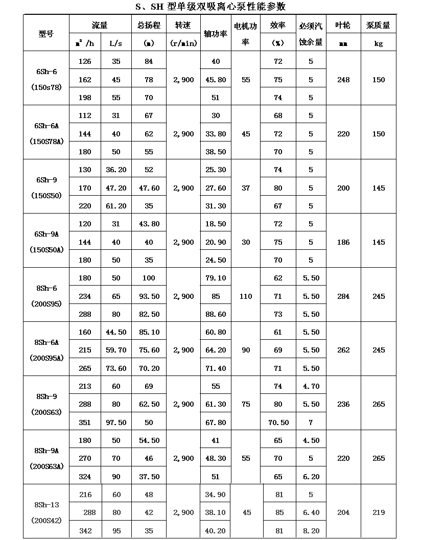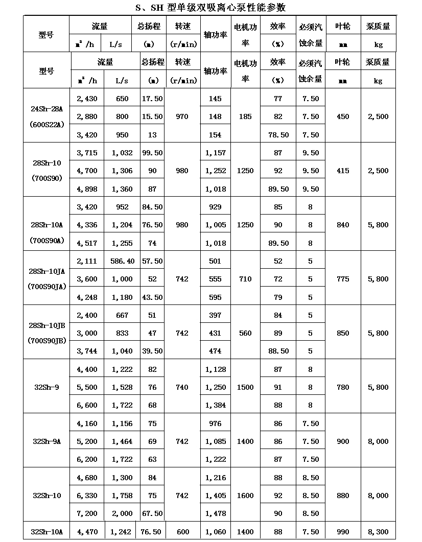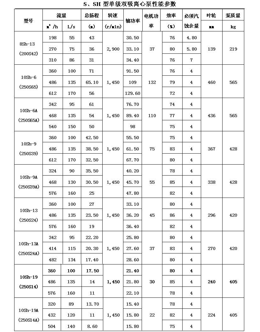 吸離心泵、S,SH型單級(jí)雙吸泵殼中開(kāi)之離心泵,供抽送清水或物理化學(xué)類似于水的其它液體之用。被輸送液體溫度不得高于80℃。